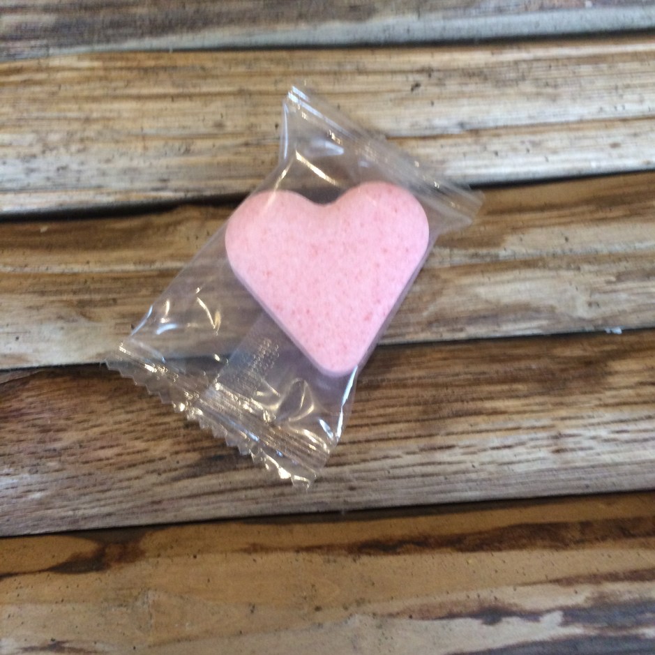 In de verpakking zitten 5 los in cellofaan verpakte bruishartjes. Ze zien er dottig uit, het lijken net snoepjes. Als ik het cellofaan opendoe, komt me een frisse geur tegemoet. Lekker ! Ik ben echt aangenaam verrast. Het ziet er heel leuk uit zo.