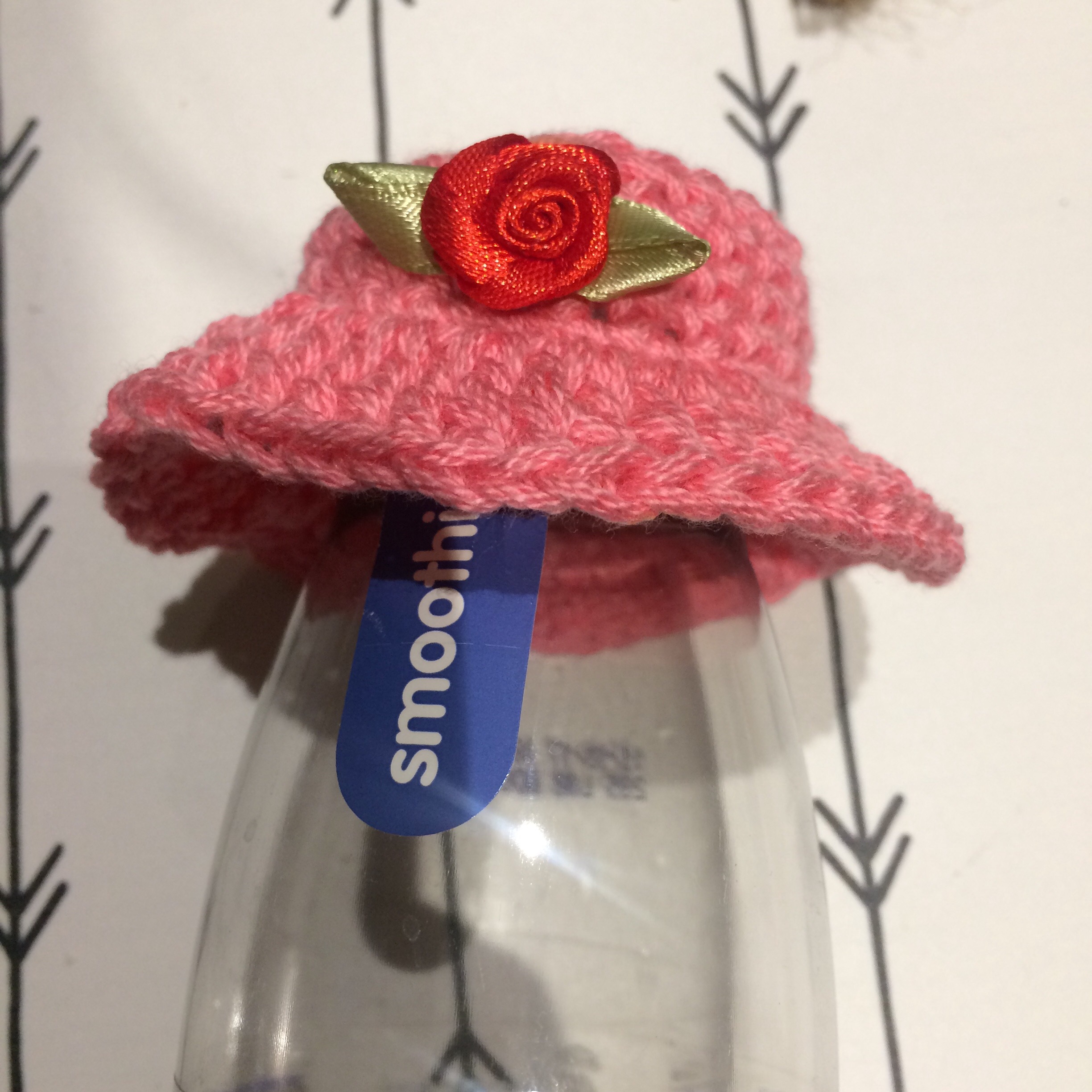 Als het goed is, past dit lapje nu precies om de bovenkant van de dop van het flesje Innocent. Het kan natuurlijk ook zo zijn, dat je wat strakker of juist wat losser haakt dan ik. Haak er dan nog een toer bij, of haal er een toer af. Het principe blijft natuurlijk hetzelfde. Datzelfde geldt voor de volgende toeren. Bij toer 8 zou het lapje groot genoeg moeten zijn om het hele dopje te bedekken. Toer 9 is dan de rand van de flaphoed.