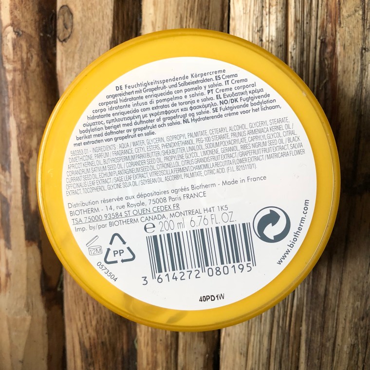 De body cream zit in een doorzichtig gele pot met een witte draaideksel. Ik vind de verpakking er typisch “Biotherm” uitzien; heerlijk fris en verzorgd ogend, zonder poespas. Bij het openmaken van de pot komt de geur van het product me tegemoet : erg fruitig. Dat klopt ook want de geur is grapefruit en salie.
