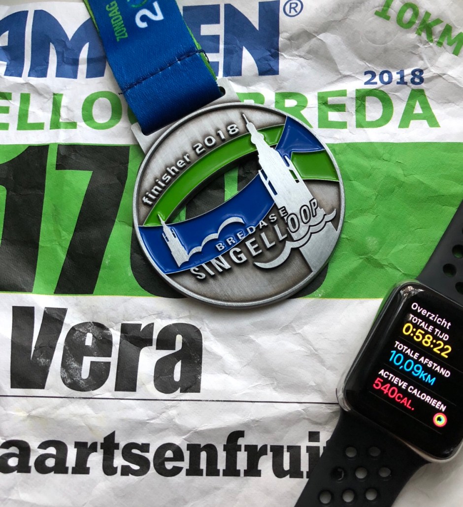 Ik zette nog een eindspurt in, en toen was ik gefinisht. Uiteraard keek ik toen wel gelijk op mijn Apple Watch, sowieso om mijn looptijd uit te zetten, en ook omdat ik stiekem natuurlijk best nieuwsgierig was naar mijn eindtijd. Want ik kan wel zo hard zeggen dat ik niet om de tijd geef, stiekem ben ik een hartstikke competitief ingesteld persoontje. Ik moest goed kijken toen ik mijn eindtijd zag, want die was waanzinnig : ik ben namelijk gefinisht in 58 minuten; 2 en een halve minuut (!) sneller dan vorig jaar. Een dik vet PR dus weer, en ik was superblij !