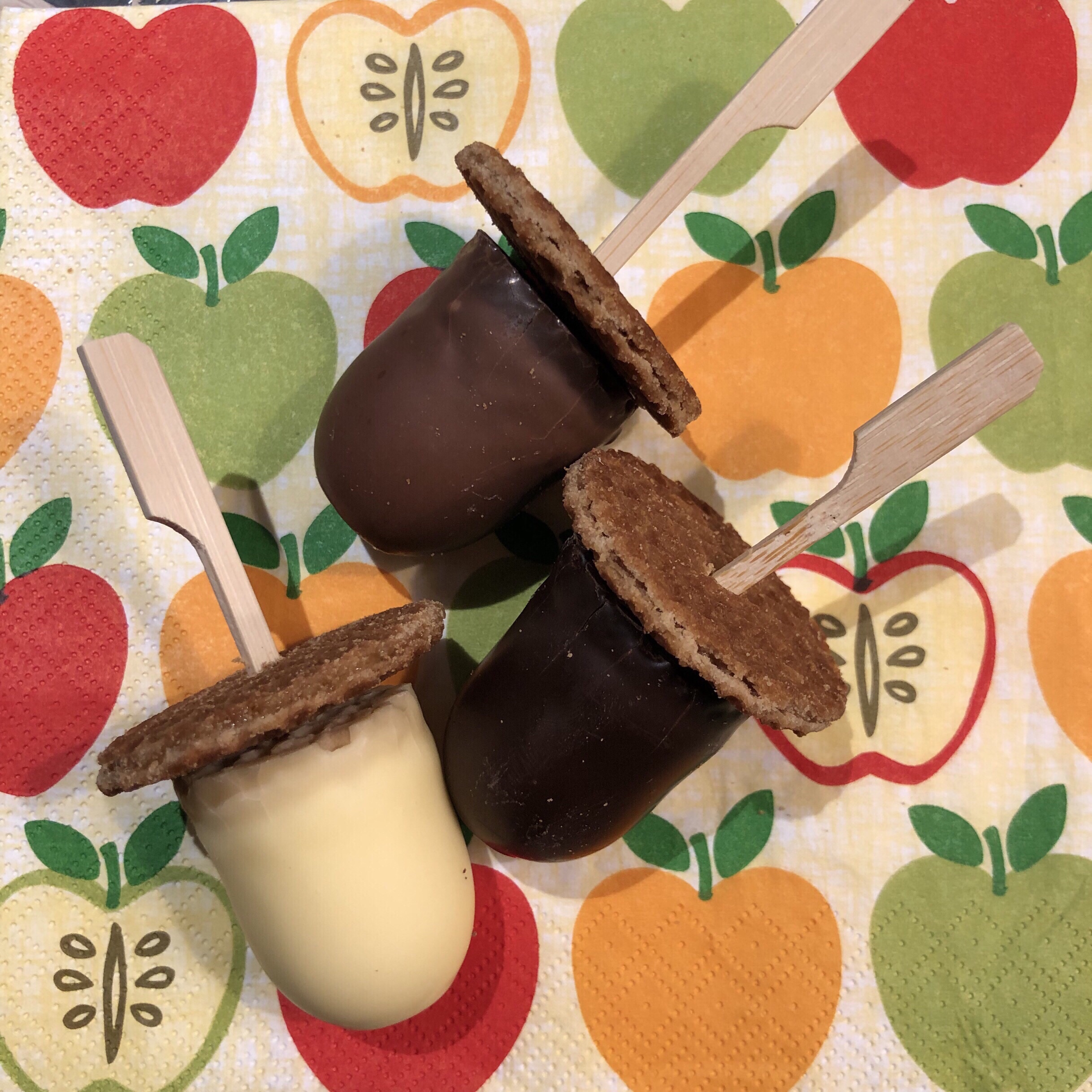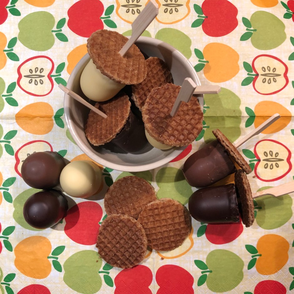 - Steek de prikker eerst door het midden van het stroopwafeltje (geloof me, probeer niet de prikker gelijktijdig door zowel de zoen als het stroopwafeltje te steken, dan knijp je de zoen tot moes !)