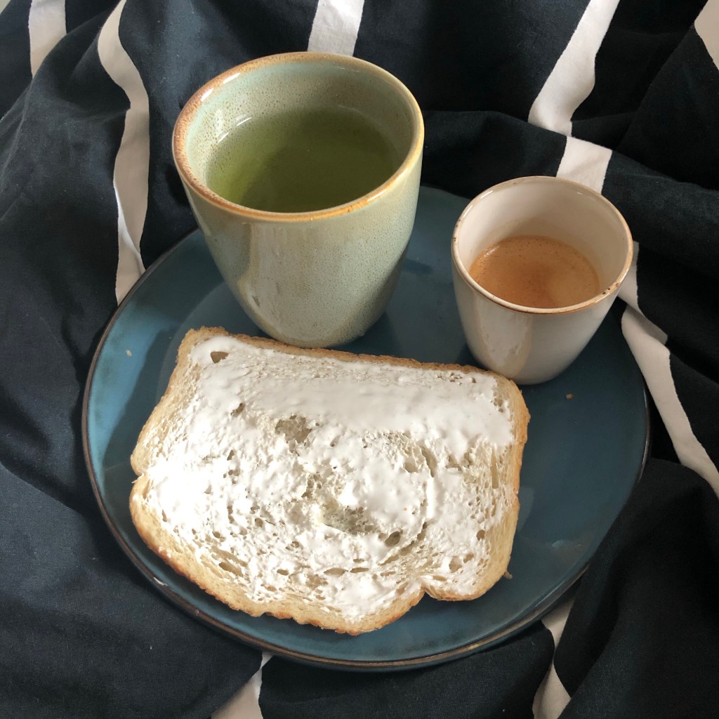 Een heerlijk begin van de dag vandaag: Little Miss C komt ontbijt op bed brengen! De witte boterham met mierzoet smeersel (marshmallow fluff) is niet echt mijn ding, maar hé, het is de gedachte die telt!