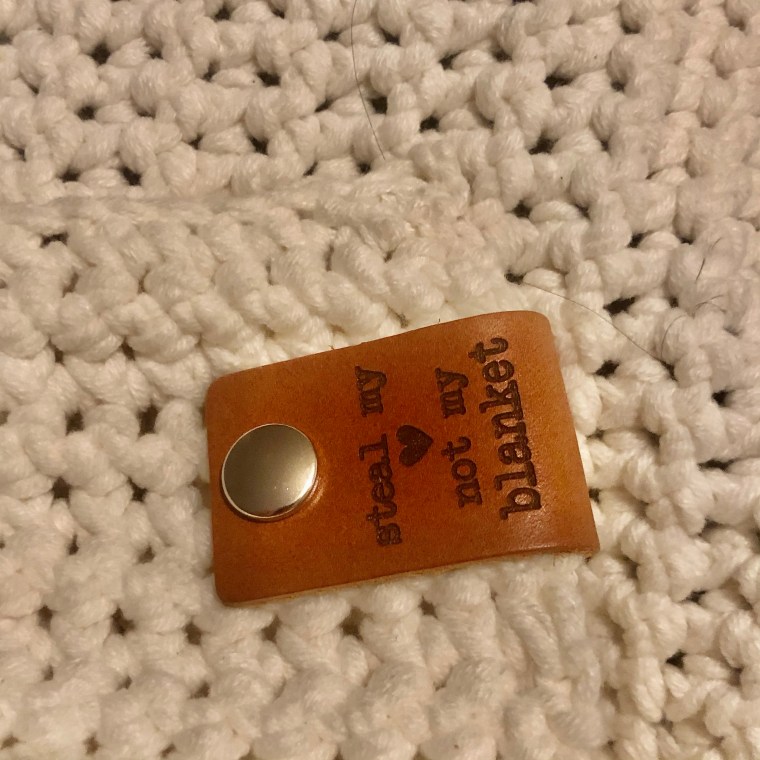 En mijn deken is klaar! Als finishing touch bevestig ik een lederen label met de leuke tekst “steal my heart, not my blanket” dat ik, als ik ‘m wil wassen, gemakkelijk kan verwijderen.