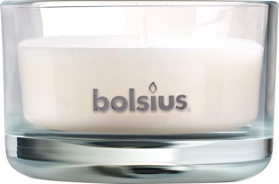 De witte kaars zit in een transparant glas, met een kleine sticker met de merknaam (“bolsius”) erop. De sticker kun je indien gewenst verwijderen, hetgeen ik gedaan heb; ik vond het geen toegevoegde waarde hebben.