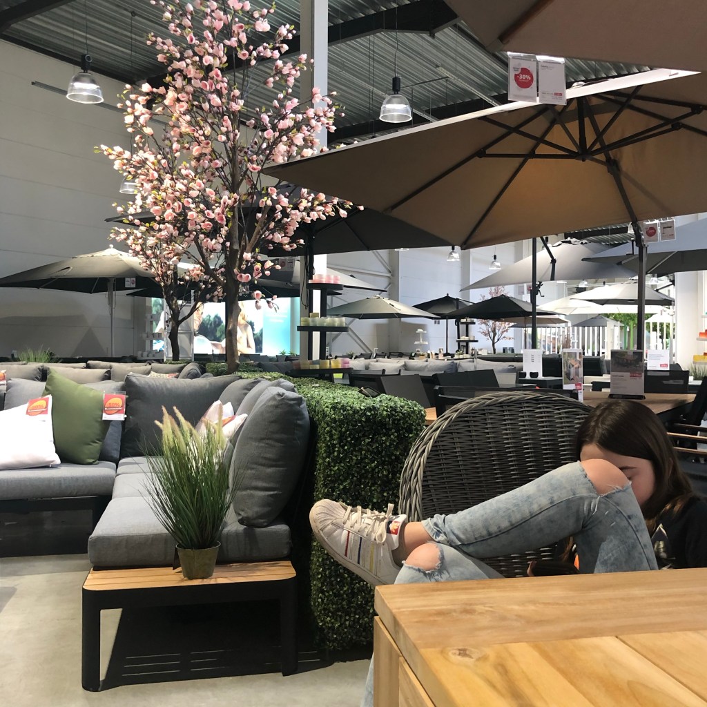 ‘s Middags vertrekken we naar een tuincentrum met als missie: een nieuwe tuinset. We hebben nu een loungeset maar we willen een eetset zodat we niet meer met het bord op schoot hoeven te eten. Al jaren willen er een, en plannen we ‘m in het naseizoen te kopen (vanwege de korting), maar telkens komt het er niet van.