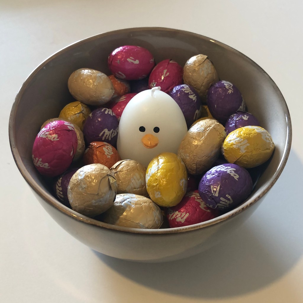 Het staat zo gezellig, zo’n schaaltje, maar nu met dat thuiswerken verdwijnen de eitjes te gemakkelijk in mijn mond …