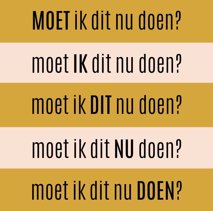 Deze vraag heeft alle belangrijke elementen in zich die bepalend zijn bij het prioriteren van zaken. Je kunt de vraag op 5 verschillende manieren lezen, al naar gelang op welk woord je de klemtoon legt. Door elke keer het accent van de vraag op één van de woorden in de zin te leggen, stel je jezelf steeds een andere soort vraag. Beantwoord je een vraag met nee, dan hoef je de overige vragen niet meer te beantwoorden en kun je het verzoek, de taak of actie naast je neerleggen of aan een ander overlaten.