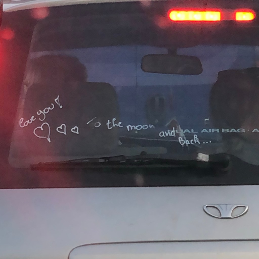 ’s Avonds doe ik mee met een lesje Bootcamp. Op de terugweg rijd ik achter een auto met deze tekst op de achterruit, leuk toch!?.