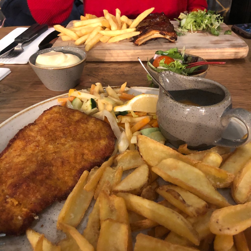 Schnitzel met pepersaus voor mij, en spareribs voor Little Miss C.
