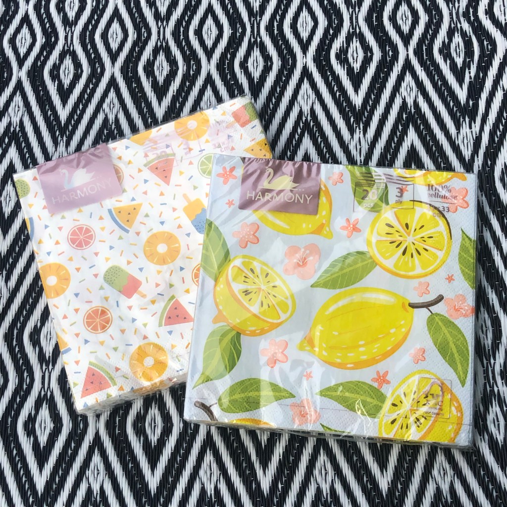 Ik vind het leuk om mijn servetten in thema te hebben. En omdat het zomer is, mochten deze 2 pakjes mee.