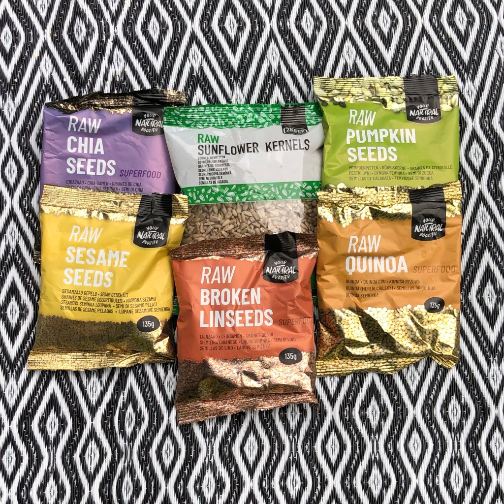 Sesamzaad, gebroken lijnzaad, quinoa, chiazaad, en gepelde zonnebloempitten … en dat alles zonder enige toevoeging. Wat een vondst; normaal gesproken koop ik dit voor veel duurder. Ik eet deze zaden trouwens graag in de maaltijd die ik standaard nuttig voor ik ga hardlopen (en dat verder bestaat uit biologische skyr en een kiwi).