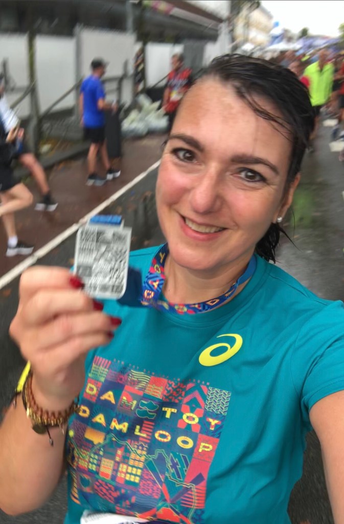 Na de finish is het nog een behoorlijk eind lopen voor mijn gevoel naar de tassenafgifte en als ik me in de stromende regen sta om te kleden, ben ik er wel klaar mee. Wat een armoe, wat een kou. Maar na een heerlijke douche, een warm bakkie soep, en een zalige pasta maaltijd bij mijn schoonmoeder thuis voel ik me heerlijk rozig en voldaan, en trots op mezelf. Damloop, I had a BLAST !