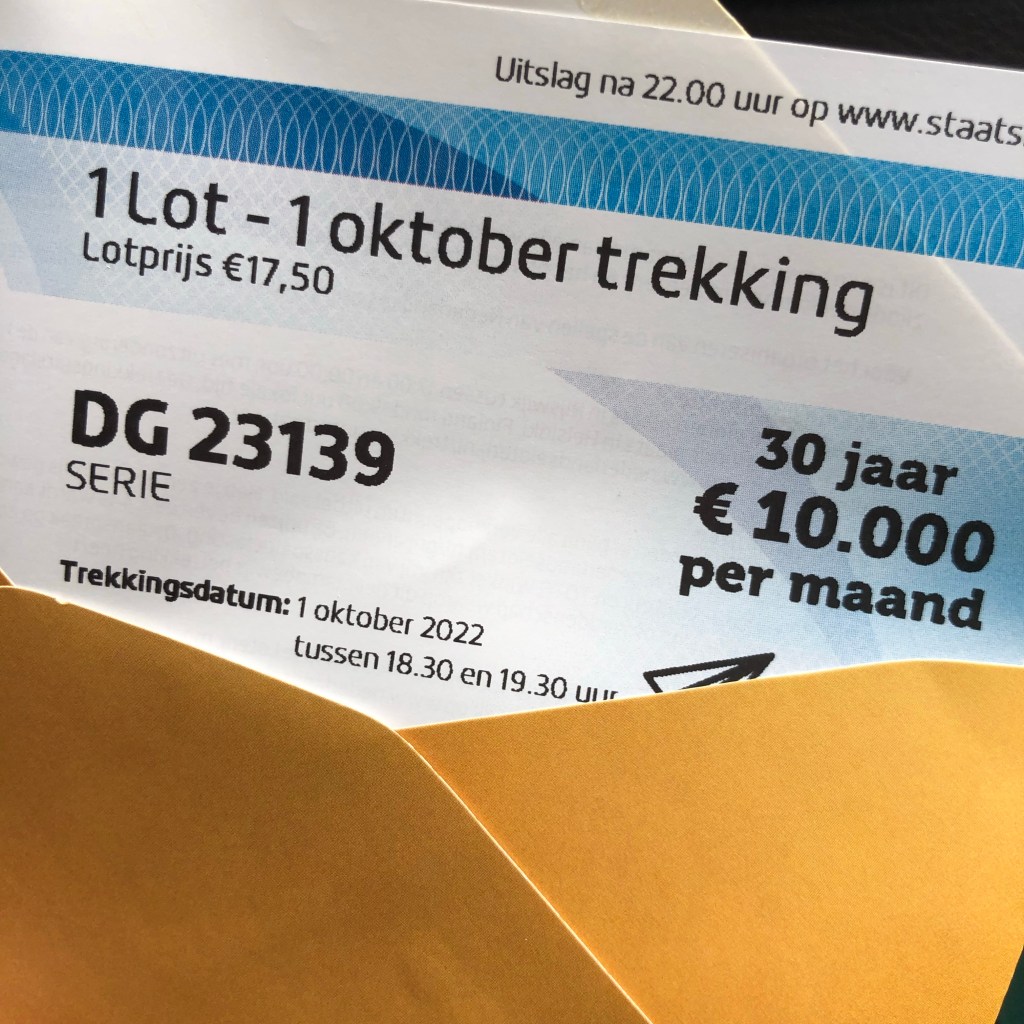 Op de terugweg naar huis rijd ik nog even langs de Albert Heijn voor een staatslot voor de droomtrekking van 01 oktober aanstaande, 30 jaar € 10.000 per maand. Al weet ik nog niet precies hoe ik dit zou gaan besteden, ik zou er zo voor tekenen.