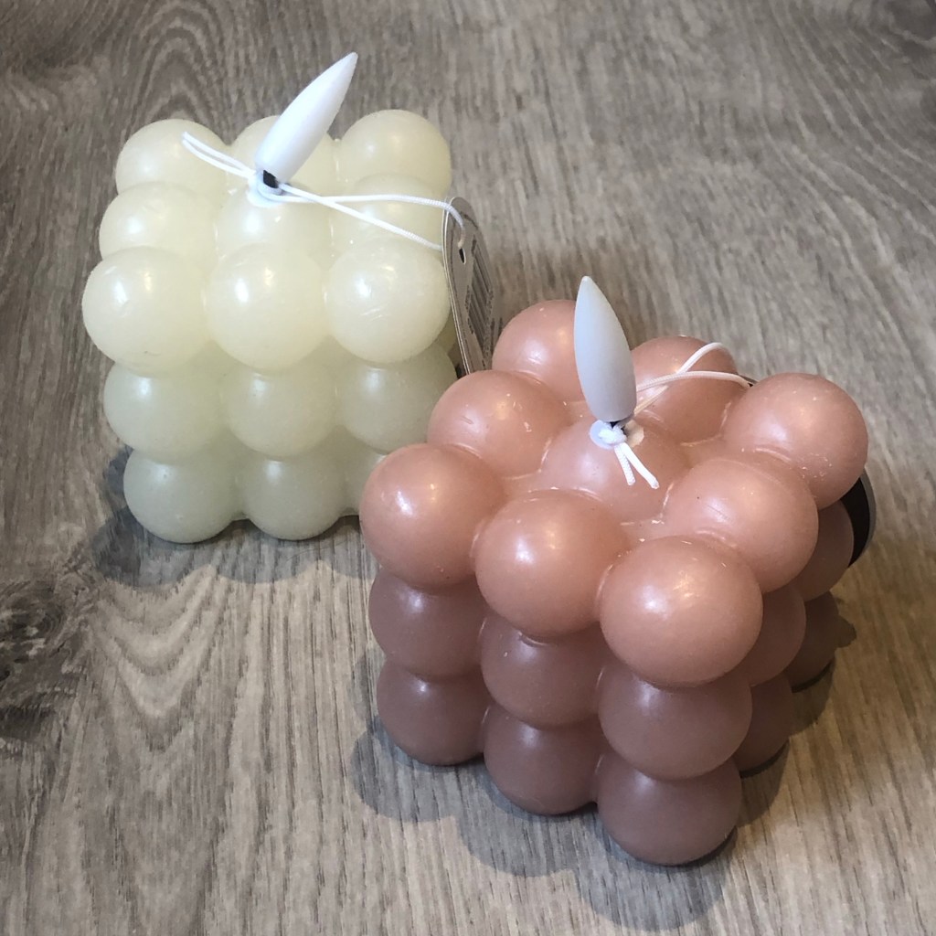 LED kaars vierkant met bolletjes, 6×6 cm, EUR 1,57 per stuk.