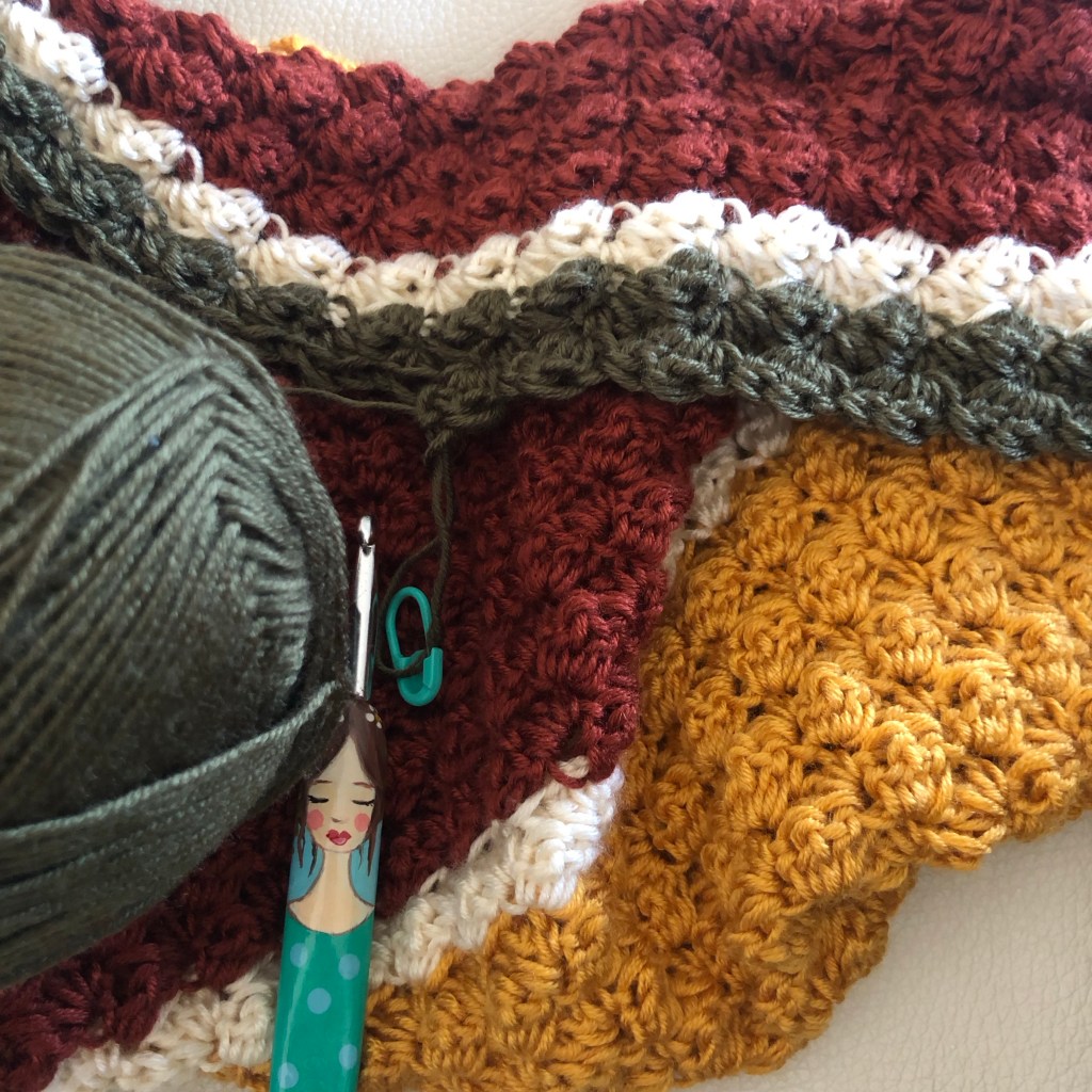 Mijn dekentje vordert gestaag. Ik heb inmiddels de 3e van de 4 hoofdkleuren aangehaakt, en ik vind het echt een mooie combinatie !