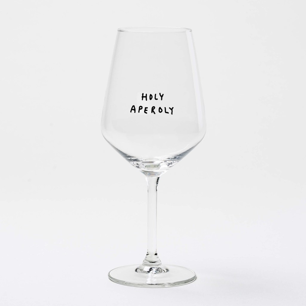 Ik vind ze helemaal te gek, die glazen van Johanna Schwarzer. Graag zou ik de glazen Holy Aperoly en They see me Aperollin’ willen hebben om mijn Aperol Spritz uit te drinken, maar de wijnglazen met tekst vind ik ook he-le-maal geweldig, dus die zou ik ook wel willen hebben.