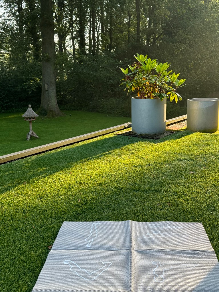 Ik start de dag met een DGM les Strong Yoga, en nou is dat op zich niet zo speciaal, maar het feit dat ik deze op mijn dakterras, in het ochtendgloren doe, wel. Het is zo sereen, zo prachtig, in die frisse lucht, met de dauw nog zichtbaar, en de fluitende vogels op de achtergrond. Ultiem genieten !