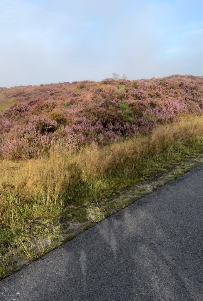 Nadat ik dinsdag een kano op mijn voet heb laten vallen (inderdaad, #hoedan?) heb ik een enorme blaar op mijn teen en kan ik maar met moeite lopen, laat staan hardlopen of zwemmen. En dat met de Dam Tot Dam-loop die eraan komt … Omdat ik mijn conditie wel op pijl moet zien te houden, start ik de dag maar met een uurtje fietsen op de Heide. Niet mijn favoriet, maar als ik er eenmaal ben, en de heide al mooi paars gekleurd zie, vind ik het toch wel prachtig hoor.
