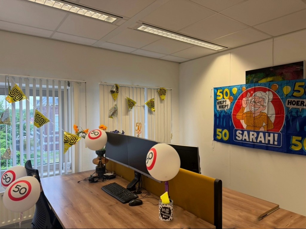 Als ik op het werk aankom, blijkt de deur van mijn kantoor geblokkeerd en is mijn werkplek aan alle kanten versierd. Ik sta de hele dag in de schijnwerpers en word gedurende de hele dag gefeliciteerd. Wat een lieve collega’s heb ik toch. Ik mag me maar gelukkig prijzen, echt waar.