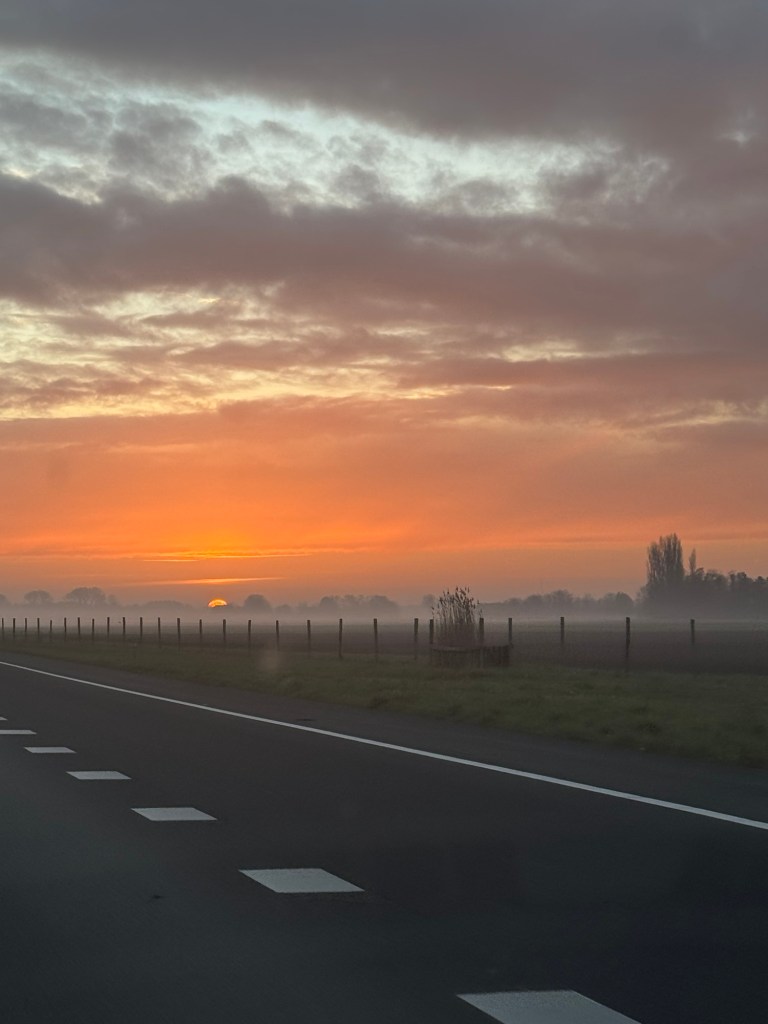 Al rijdend verwonder ik me over de prachtige zonsopgang en de dauw over de velden; wat is de natuur toch mooi ! Echt een prachtig begin van de dag. Maar niet alleen het begin is mooi, de dag zelf ook, en de afsluiter al helemaal. Ik heb namelijk een superleuke en gezellige fun run op het werk. Moe maar voldaan rijd ik naar huis.