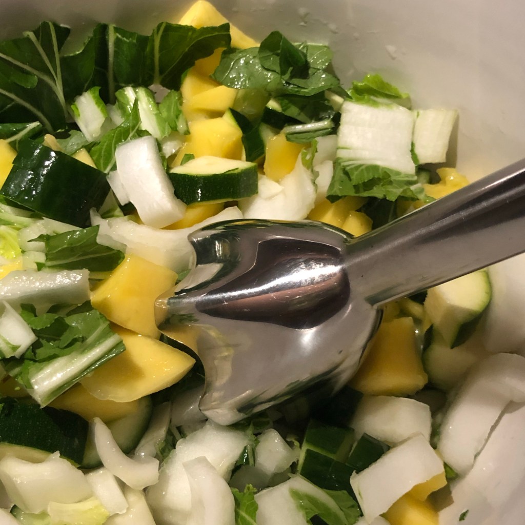 Vandaag staat een smoothie met paksoi, mango, komkommer, courgette, en limoen op het menu .
