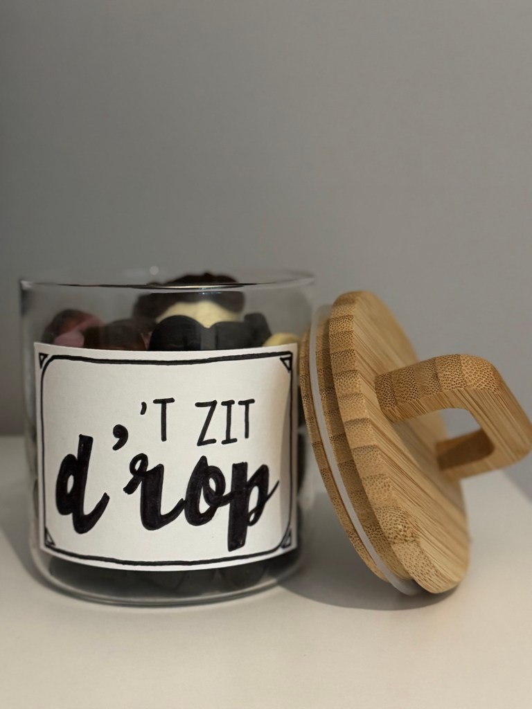 Ik kocht de glazen pot met bamboe deksel (inhoud 600 ml) bij Action voor EUR 1,72. Ik had nog blanco etiketten liggen, waarop ik zelf de tekst ’t zit d’rop (oftewel : het zit erop) op handletterde. Nadat ik de pot vetvrij gemaakt had, kleefde ik de etiket erop.
