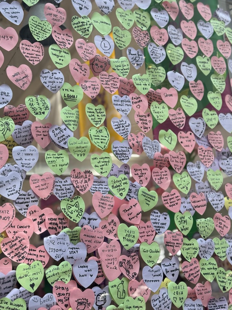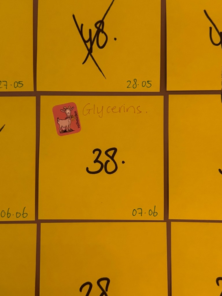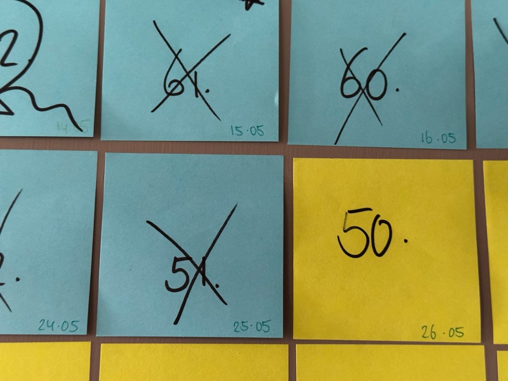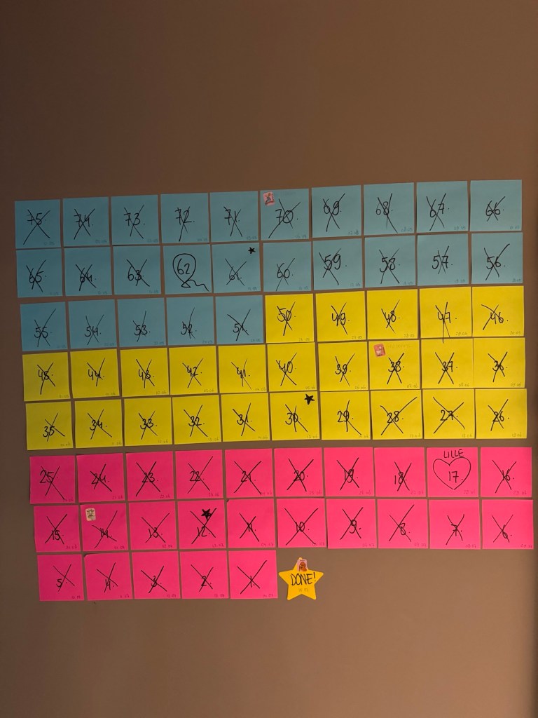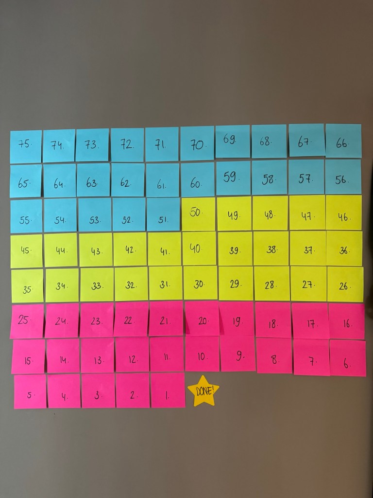 75 sticky notes aan de muur, voor de 75 dagen die deze challenge duurt.