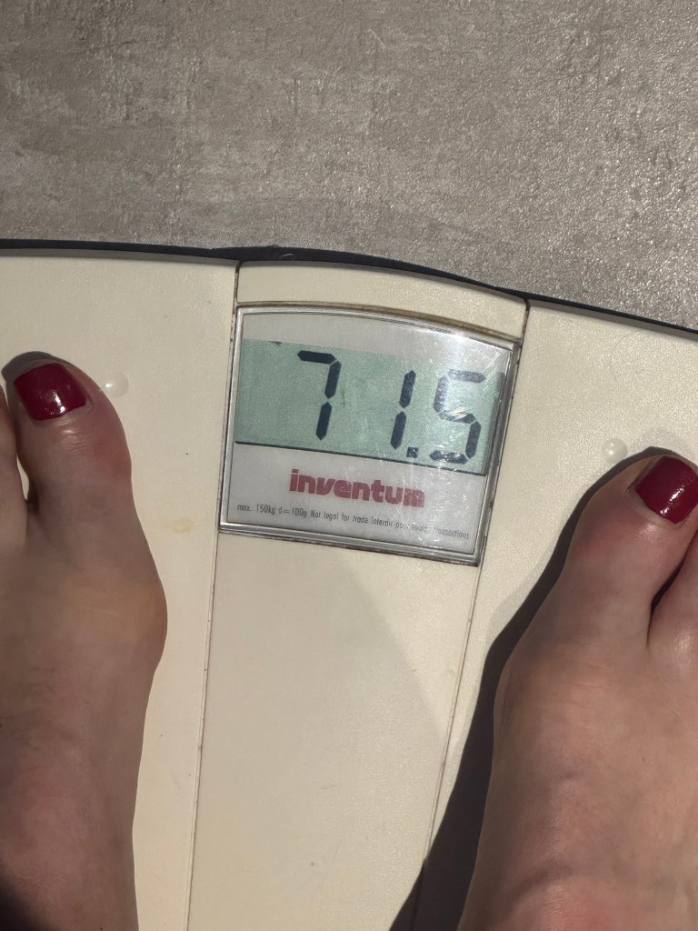 En hiermee zit mijn challenge erop … de challenge die ik op 01 mei 2025 startte en die ik al zolang van plan was te gaan doen, maar nooit aandurfde. Al met al kan ik zeggen dat het me alles mee gevallen is. En met 7 boeken, tientallen ommetjes, nieuwe inzichten, doorbroken patronen, bijna geen suikercravings, geen enkele hang naar alcohol, nieuwe gerechtjes, mooie stappen in mijn persoonlijke ontwikkeling, een nieuwe hobby als vogelspotter, en duidelijker grenzen mag ik denk ik wel zeggen dat het me ook veel opgeleverd heeft. Oh, en dan is er natuurlijk ook nog mijn gewicht. Is het me uiteindelijk gelukt om onder die 70 kg te komen ? Nou, hier komt ie, de laatste foto :