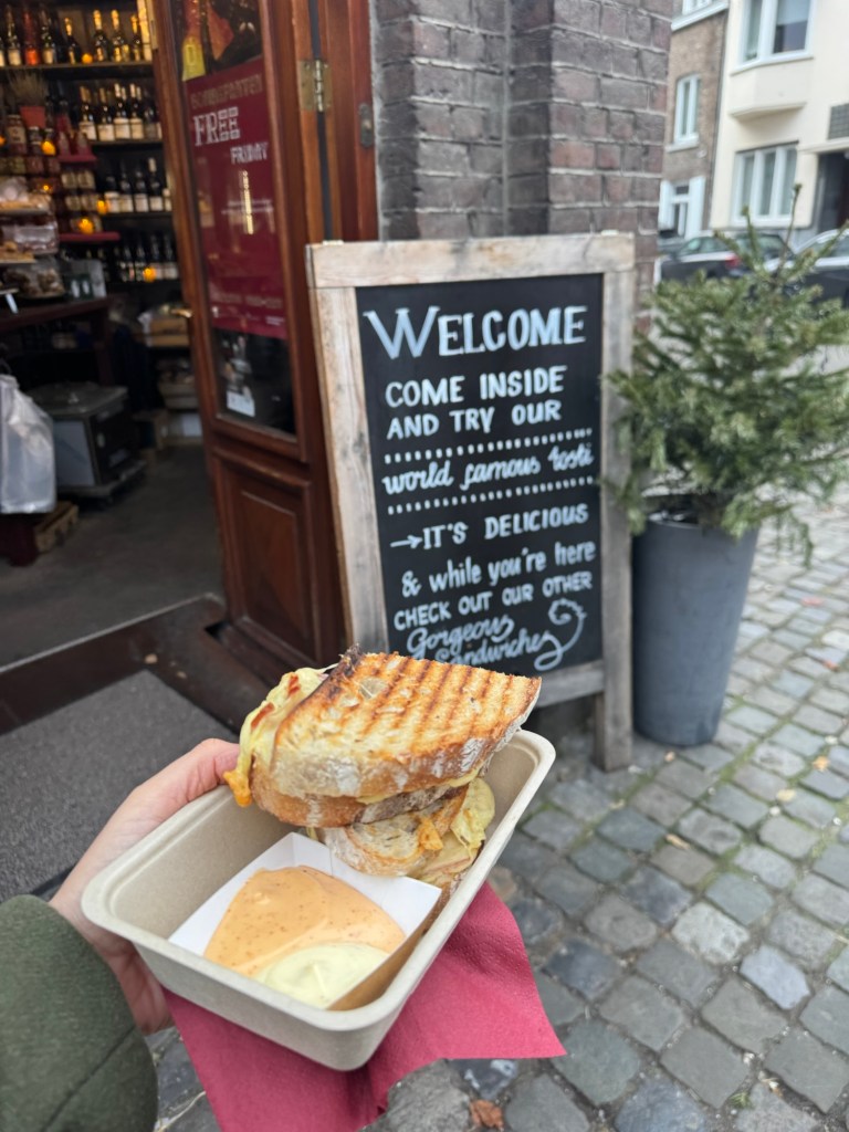 Mijn solotrip begint meteen goed met de inmiddels viral tosti van Le Salonard. Ik ging voor de ham-kaasvariant met truffel én spicy saus … tien minuutjes wachten, €9,50, en absoluut de moeite waard. Tip: deel ’m als je met z’n tweeën bent, want hij is écht enorm vullend.