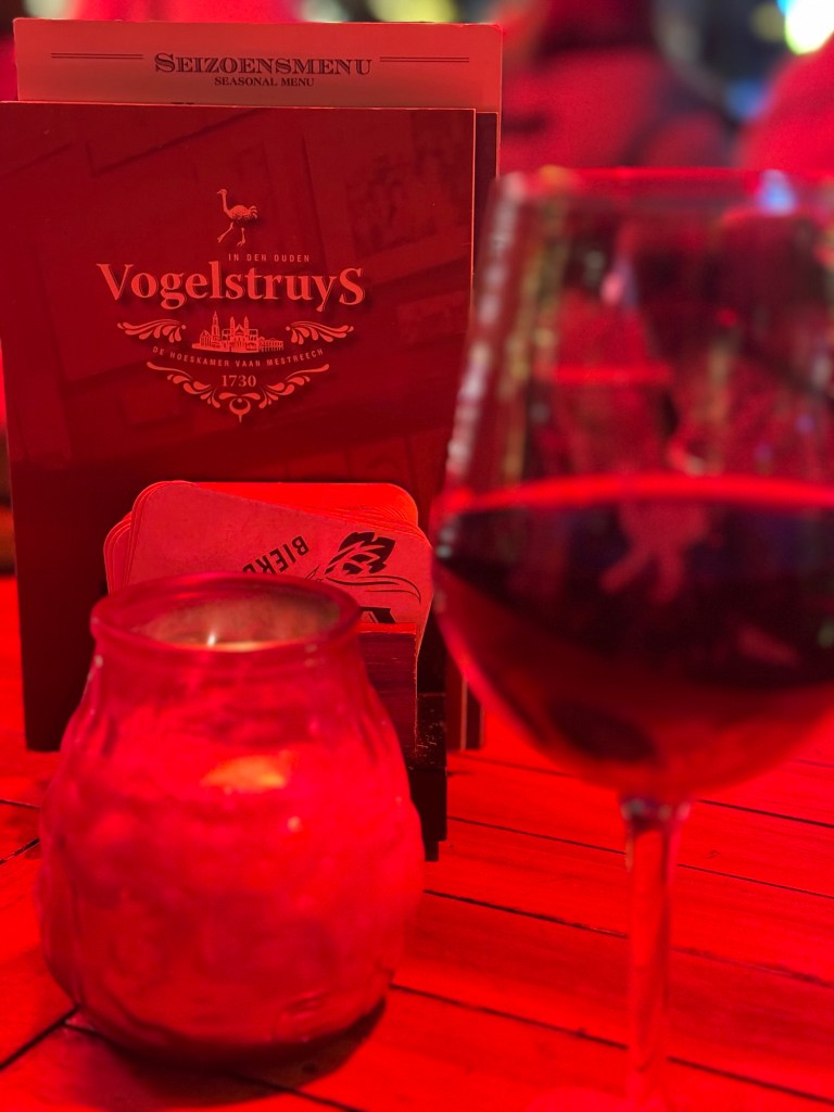 Ik sloot de dag af bij In den Ouden Vogelstruys, waar ik genoot van een lekker wijntje, mét uitzicht op Magisch Maastricht dat schitterde op het Vrijthof.