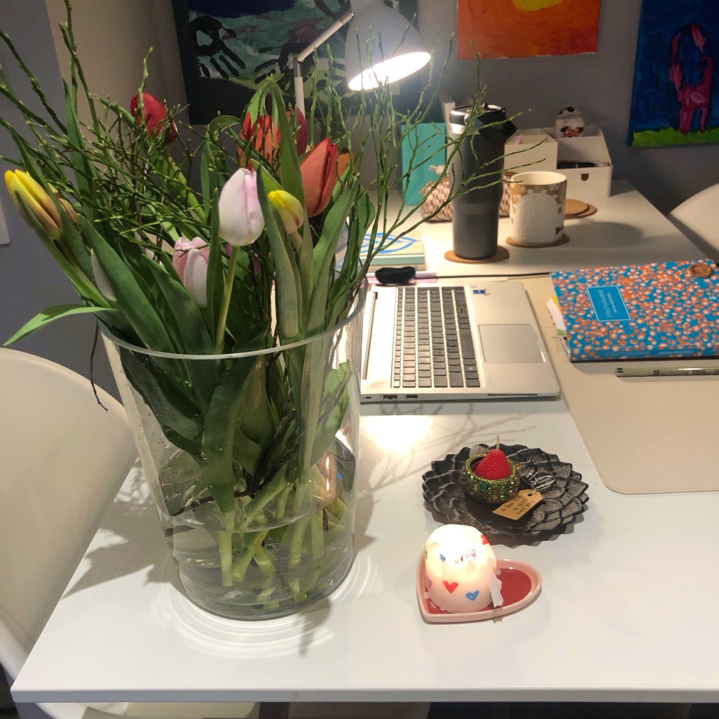 Ik kocht tulpen voor op mijn bureau in mijn thuiswerkkantoor. Je moet het jezef gezellig maken toch ! #TLCForMe