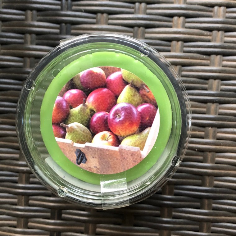 De kaars zit in een dik glas met een plastic deksel erop. Op het deksel zit een sticker van een kist met appelen en peren en op het glas zit een plaketiket met daarop de productinformatie geschreven. Dat laatste ziet er natuurlijk lelijk uit, maar het etiket laat zich gelukkig makkelijk verwijderen. Hierdoor kun je het glas nadat de kaars op is prima hergebruiken als bijvoorbeeld waxinelichthouder.