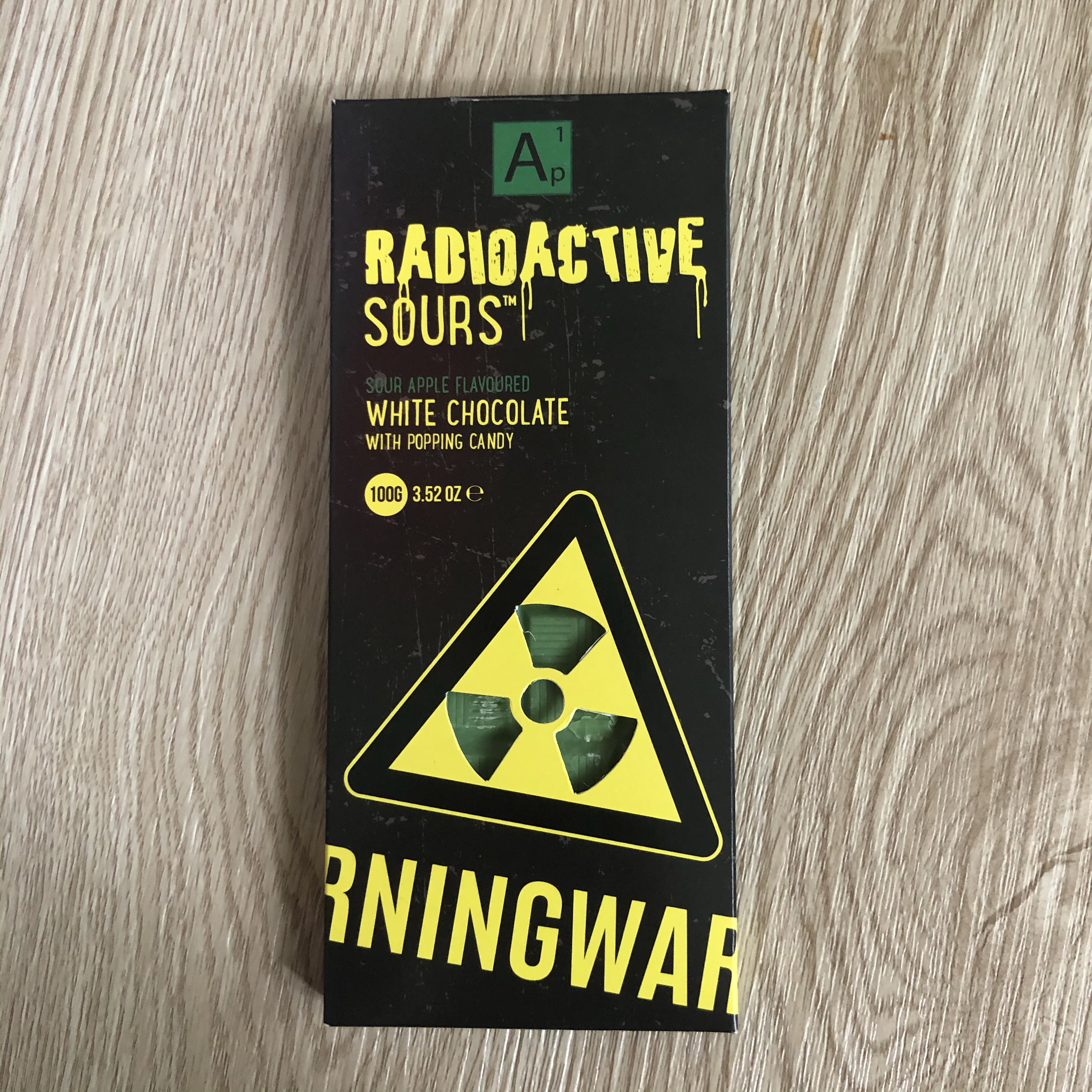 De chocolade zit in een mooie verpakking, een beetje nucleaire look, passend bij de merknaam ” radioactive sours“.