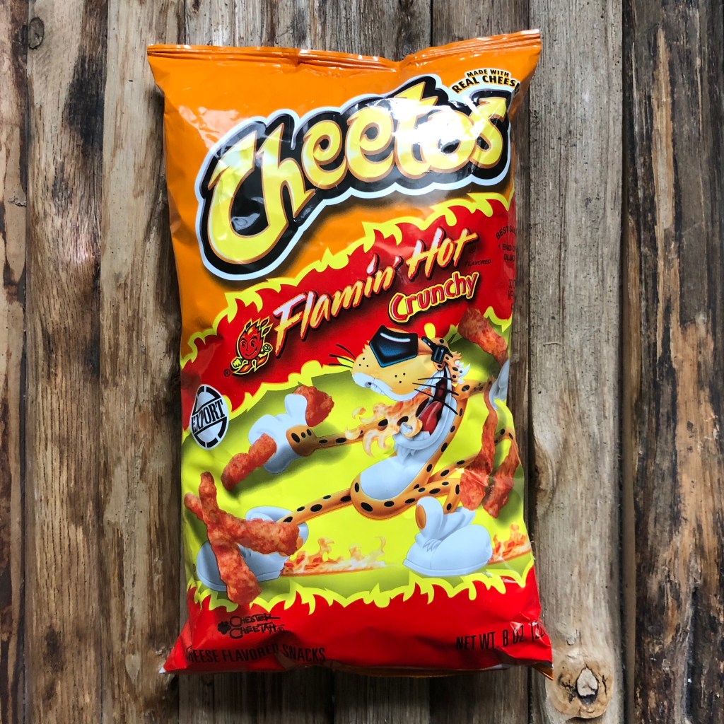 Als ik de verpakking Cheetos Flamin’ Hot Crunchy zie, herken ik ‘m direct als van het merk Cheetos zijnde. Als kind was ik namelijk gek op de zoutjes van dit merk, met Chester Cheetah als mascotte. Ik heb er de nodige opgegeten hoor. Tegenwoordig staat Chester niet meer op de zakken Cheetos, en is Nibb-It, van die eekhoorn, weet je nog?, inmiddels ook onderdeel van dit merk. Maar dat terzijde; op de zak Flamin’ Hot Crunchy is mijn good old friend Chester prominent aanwezig, en daar werd ik vanuit een soort jeugdsentiment stiekem een beetje blij van.